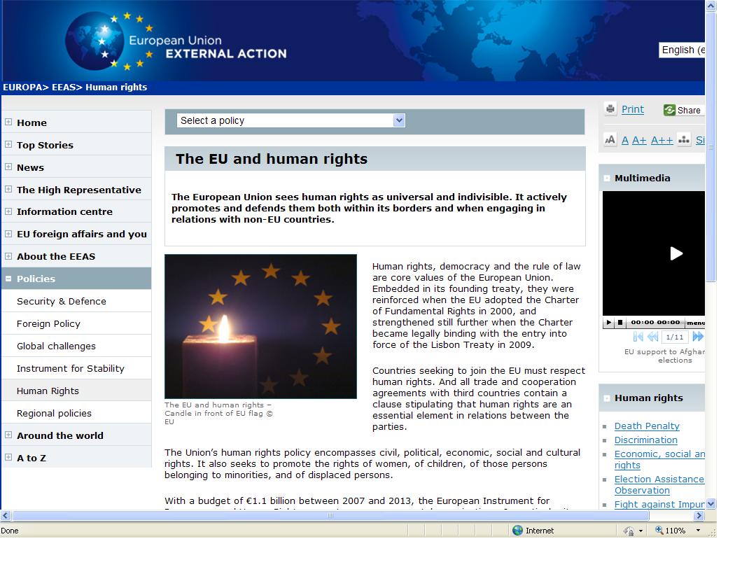 multilateral forums (UN, OSCE, Council of Europe). The EU's human rights competences are, however, not unlimited, but the EU can act only in areas, over which it has competence under the Treaties. Link: http://eeas.europa.eu/_human_rights/index_en